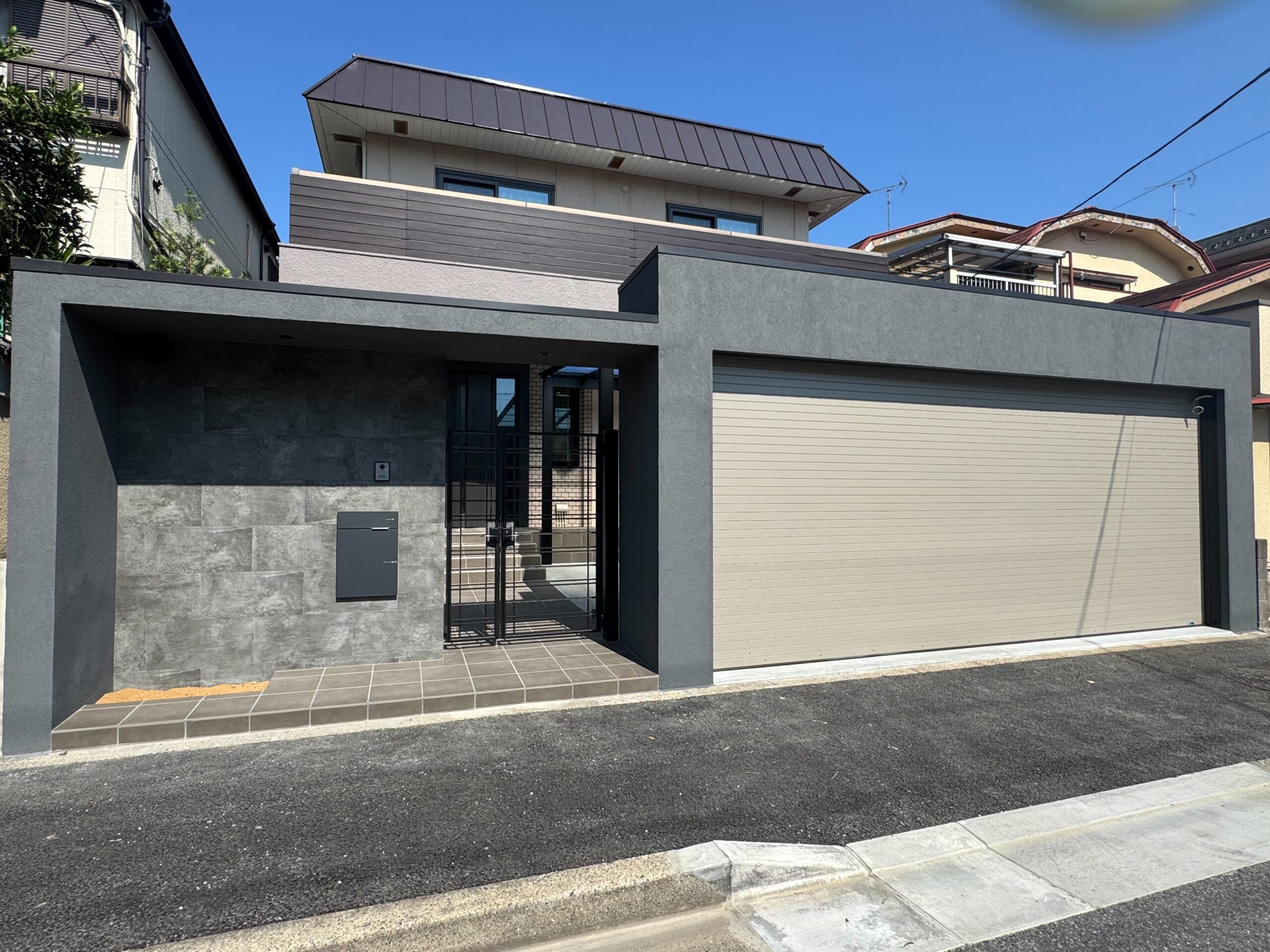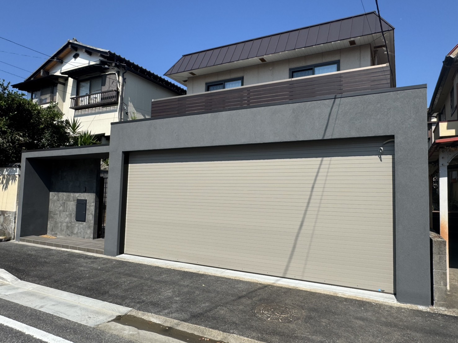 くぐり門扉と一体化させたスッキリしていて重厚感あるあつらえにリフォーム。 シャッターはポルティエでスピーディかつ静かに開閉。 ブラックでまとめた大人テイストな雰囲気は街ゆく人も振り返る品ある外観に。